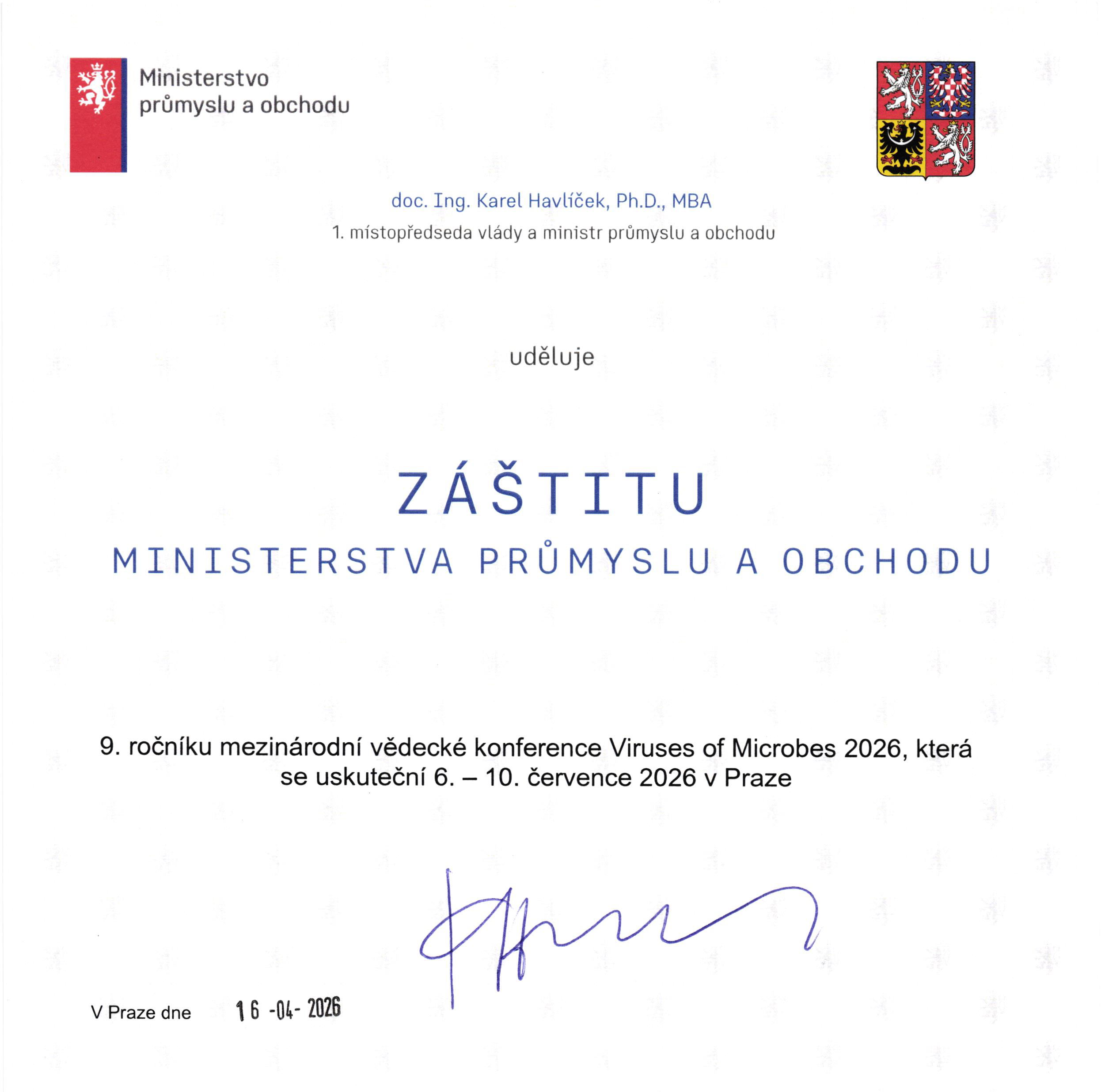The Minister of Industry and Trade of Czech Republic, doc. Ing. Karel Havlíček, Ph.D., MBA, is granting patronage to the international microbiological, biotechnology and scientific conference Viruses of Microbes 2026.